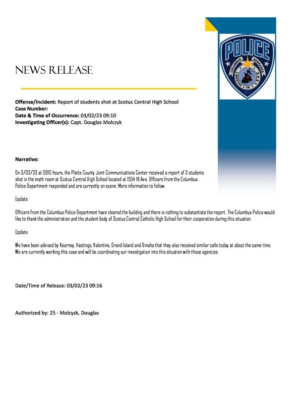 Parents, All CPS buildings were put in a brief lockout due to a reported off site shooting and suspect not apprehended. The lockout has been lifted following verification from the Columbus Police Department (CPD) that a call was received of a report of 3 students shot at Scotus Central High School. According to CPD Capt. Molczyk, CPD officers responded, were on scene and found to be a false report.