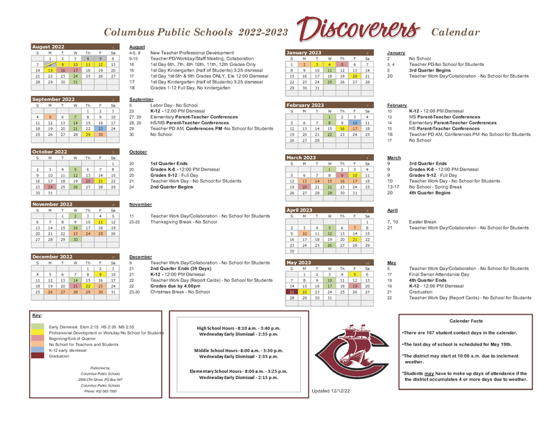 It has been determined that Columbus Public Schools had too many teacher contract days on our 2022-2023 calendar. The certified staff has voted and to make up that day we will adjust our school calendar as such: