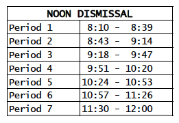 - Students--Friday, February 10 will be a 12:00 p.m. dismissal. Breakfast will be served, but no lunch on this date. We will be using the noon dismissal schedule which is below.